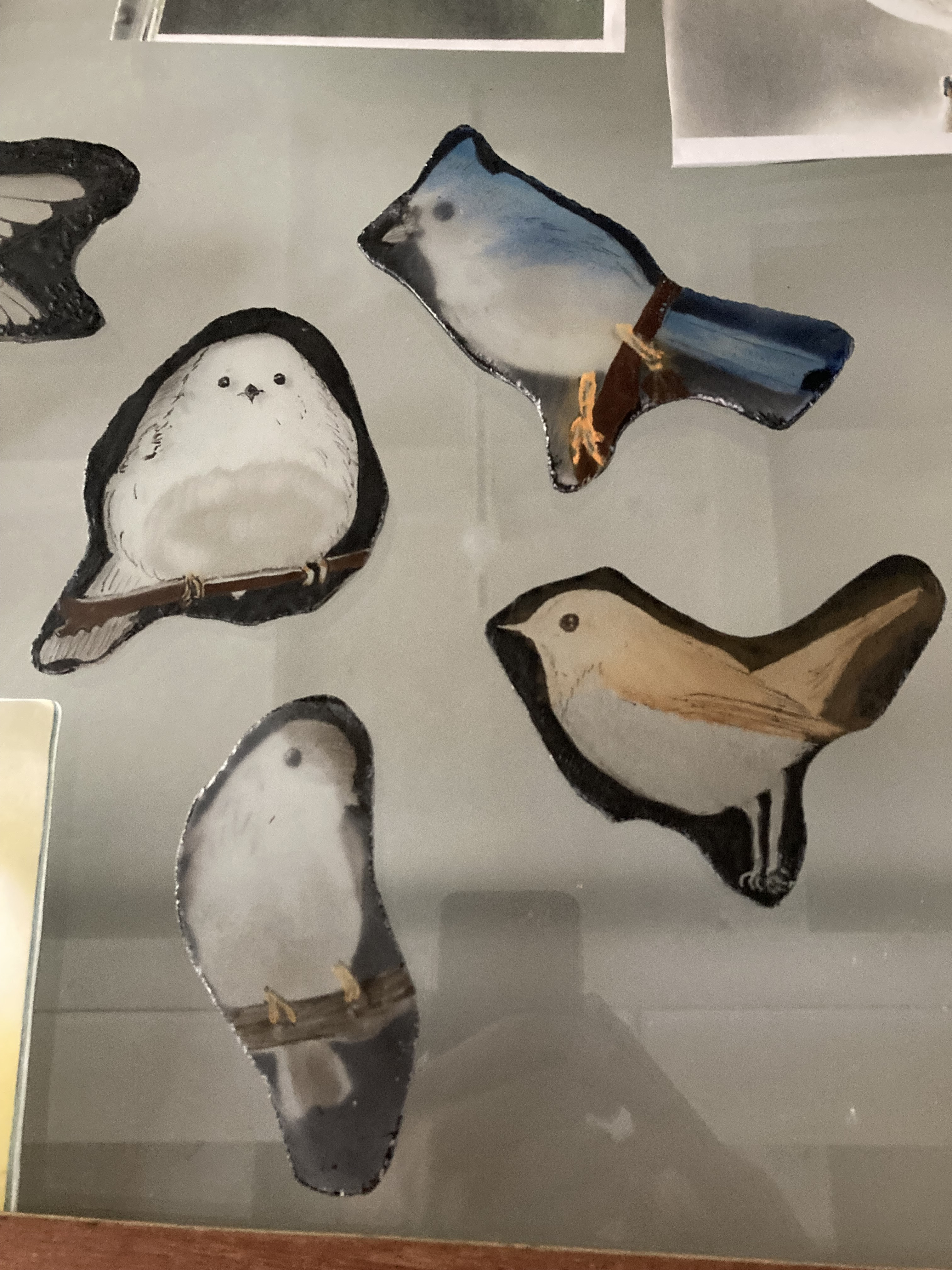 枝で羽を休める小鳥たちは、絵付けピースになっています。仕上がった背景に最後にハンダで取り付けました。