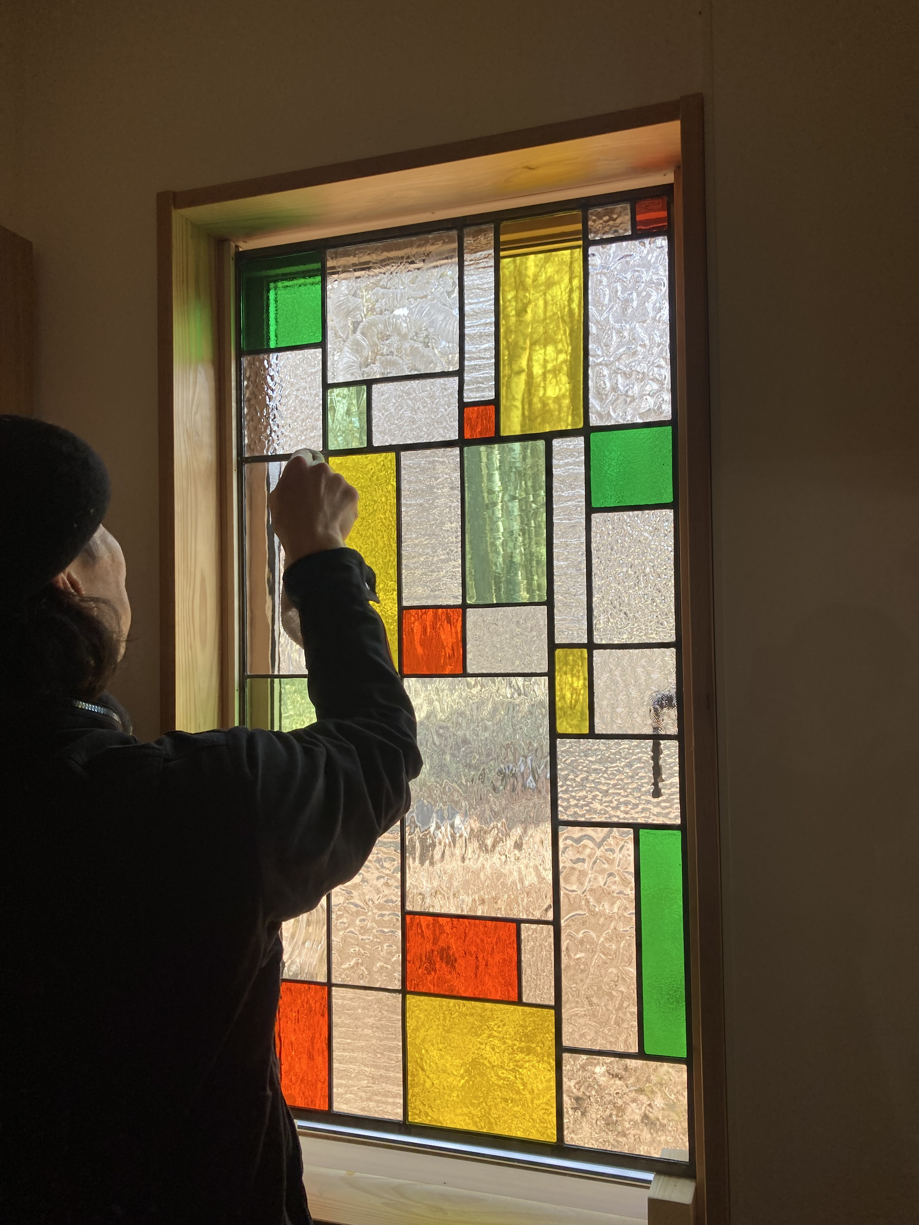 寒い地域のため、冬に結露の手入れができるようにあえてステンドグラスの上下に「隙間」を作るように窓をセッティングしました。湿気がたまらず、拭き掃除が容易になるように工夫しました。